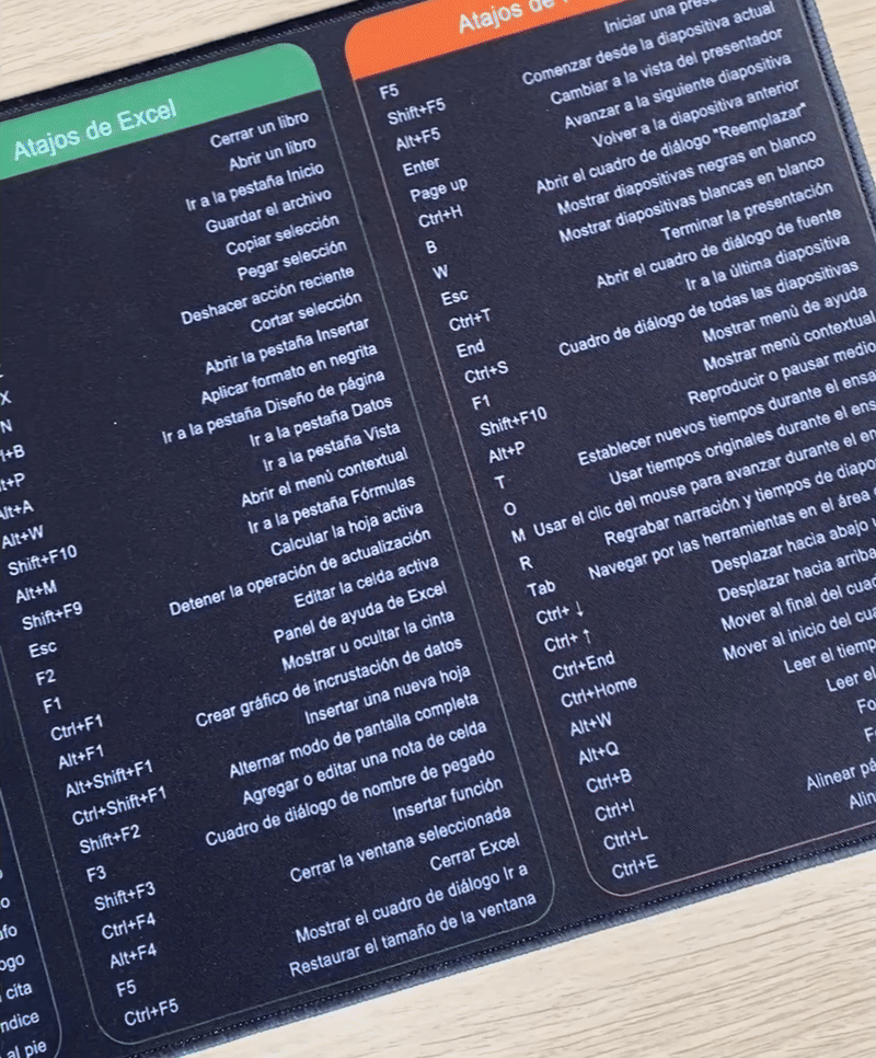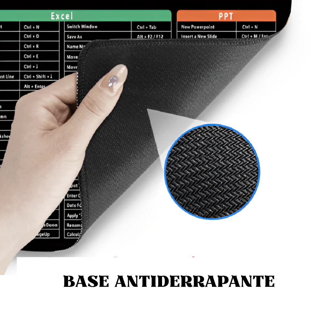 Este tapete es la solución ideal para transformar tu espacio de trabajo en un ambiente más eficiente y organizado. Con atajos impresos en alta definición del software principal de office.