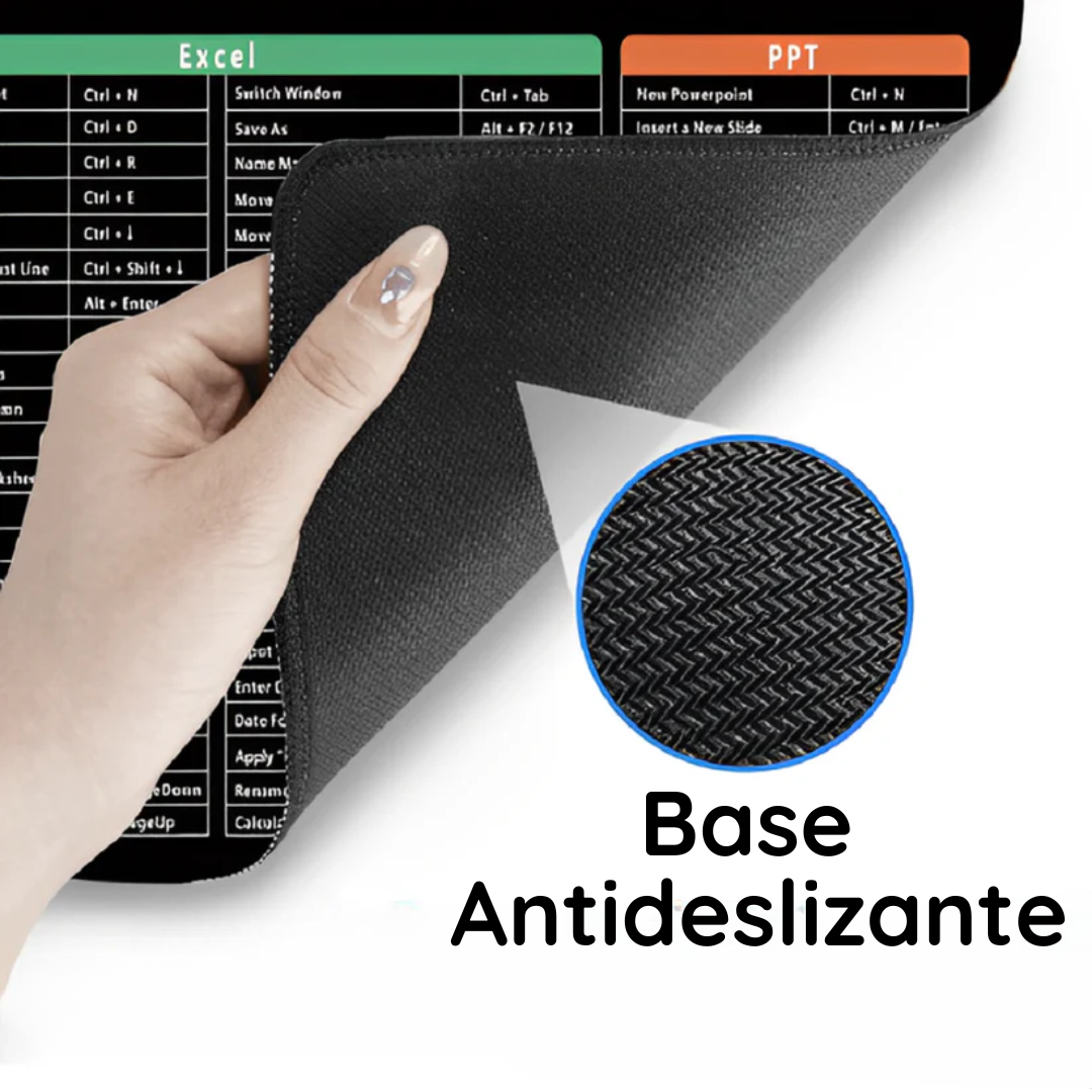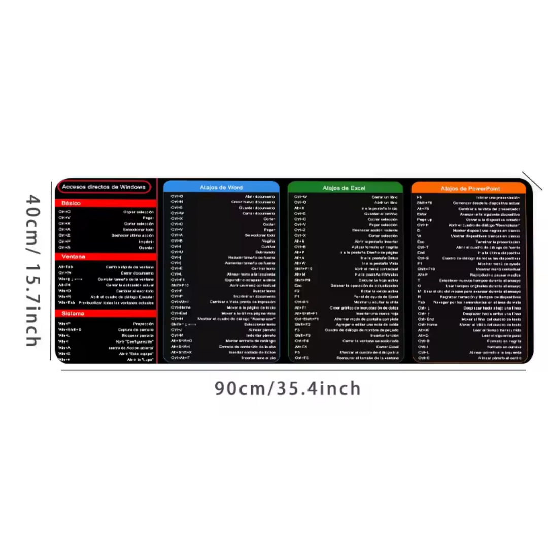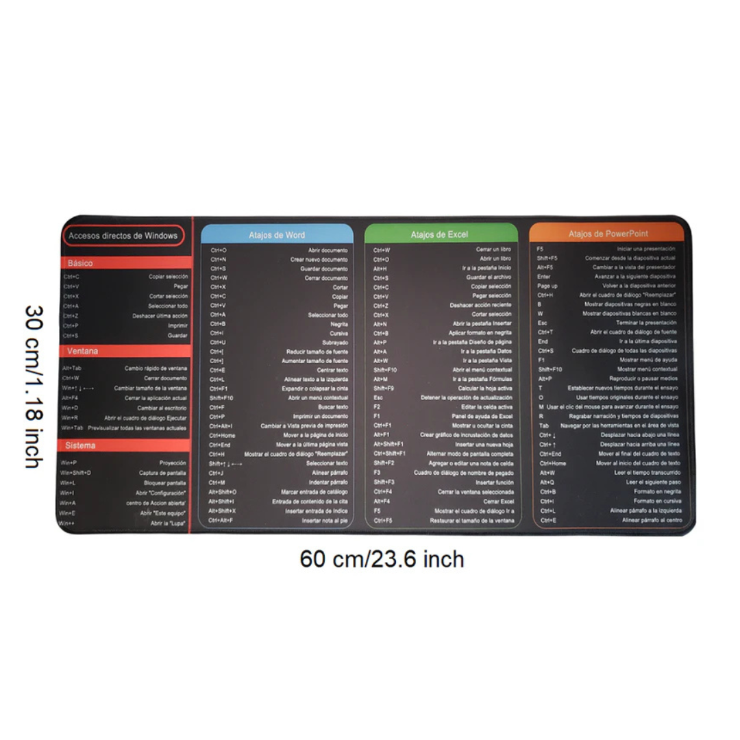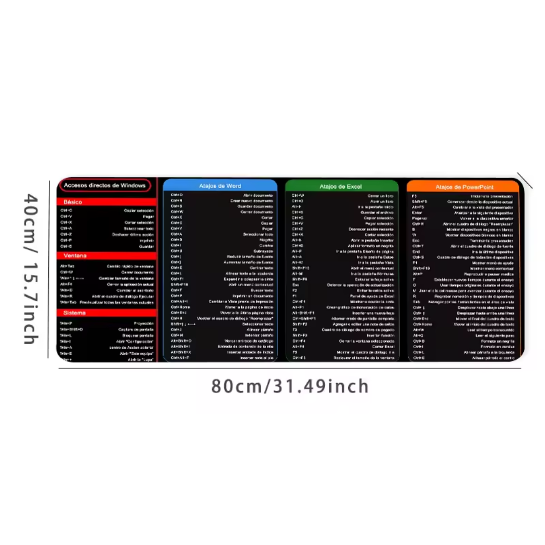 Este tapete es la solución ideal para transformar tu espacio de trabajo en un ambiente más eficiente y organizado. Con atajos impresos en alta definición del software principal de office.